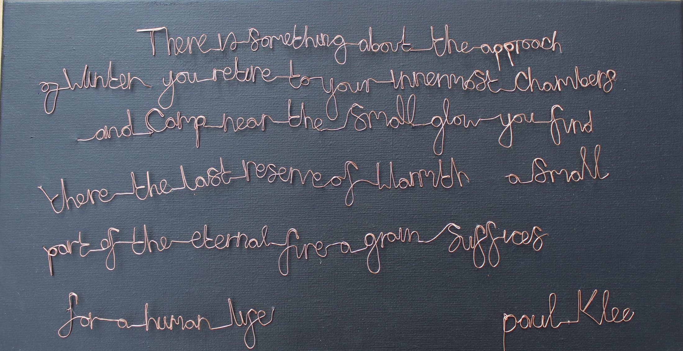 “I take inspiration from the people I have met growing up, and continue to meet, living and working in and around London, and on my travels. I draw and photograph people I find interesting, and have kept sketchbooks for over 20 years which are full of drawings of people I have met drawn from memory. I have used the drawings in my sketchbooks as inspiration for my wire portraits. I like the challenge of working in wire and trying to recreate simple line drawings from my pen/pencil sketches, and also create pieces of writing in wire, using favourite quotes, poems and song lyrics. I have an ongoing photography project called the back project where I photograph people from behind, usually without their knowledge / permission – although sometimes I get caught and have to explain myself”.